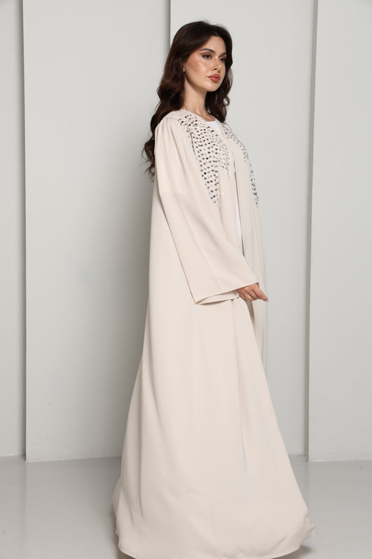 Modern Open Abaya with Silver Sequin Handwork | Premium Fabric Cream Edition