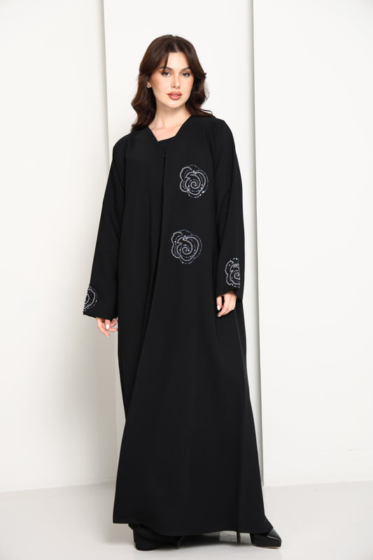 Jet Black Abaya with Hand-Placed Crystal Swirls
