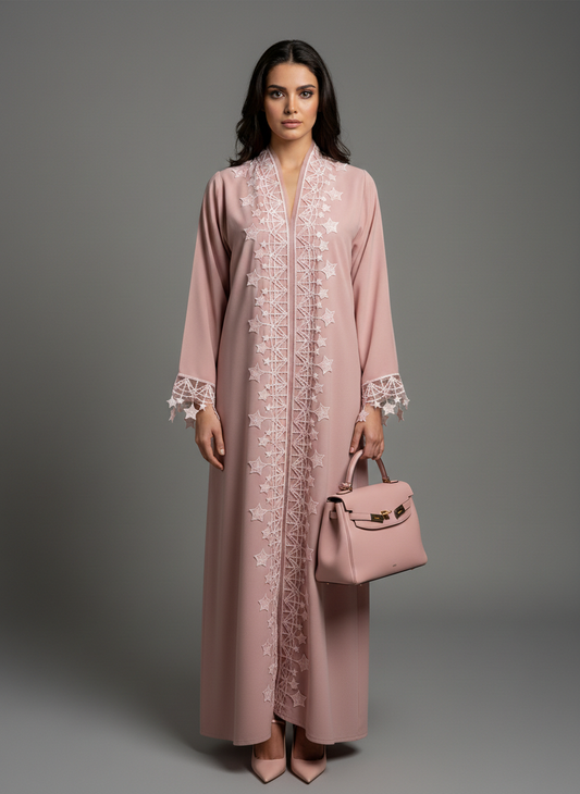 Pink Designer Star Lace with Matching Headscarf Front Open Abaya