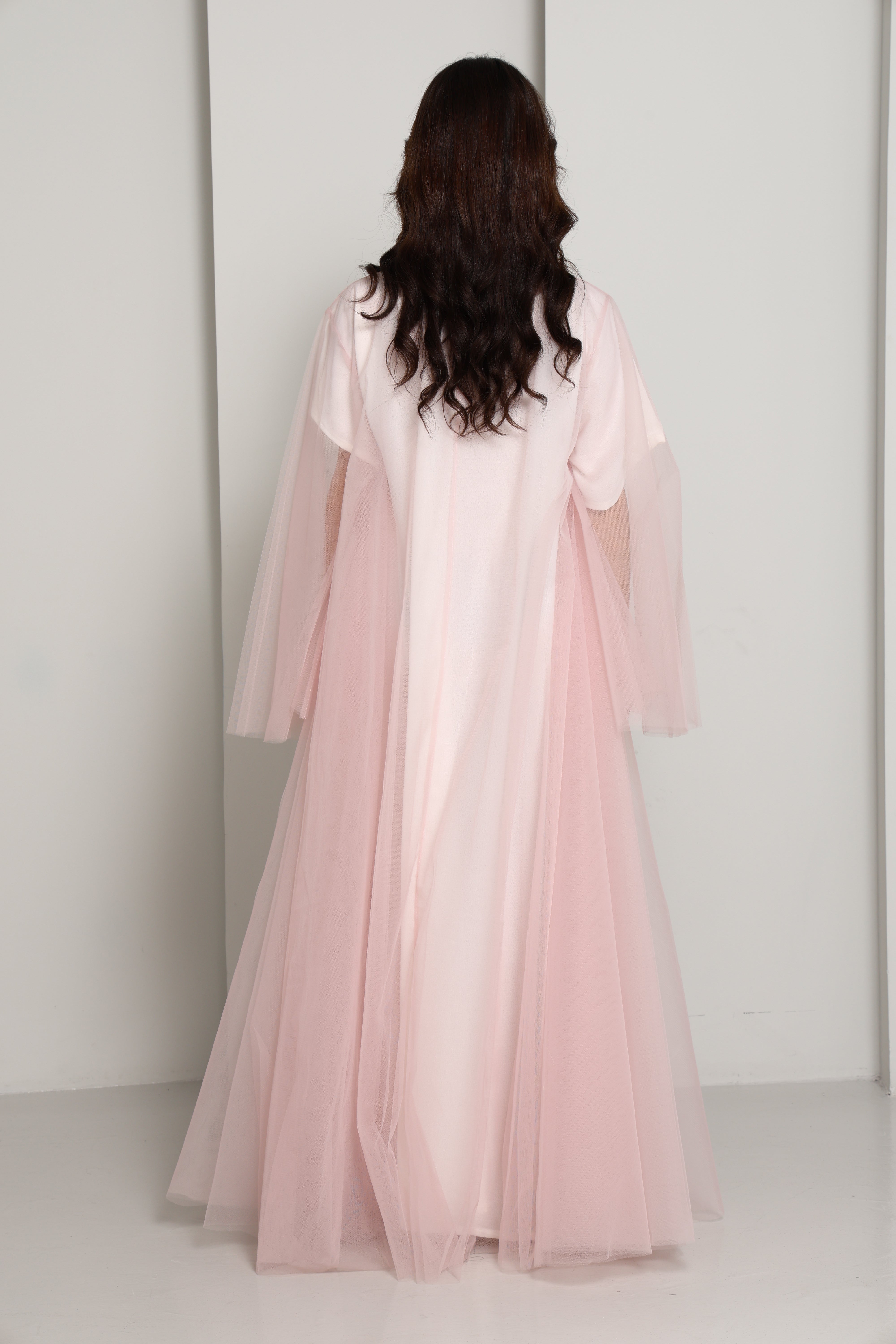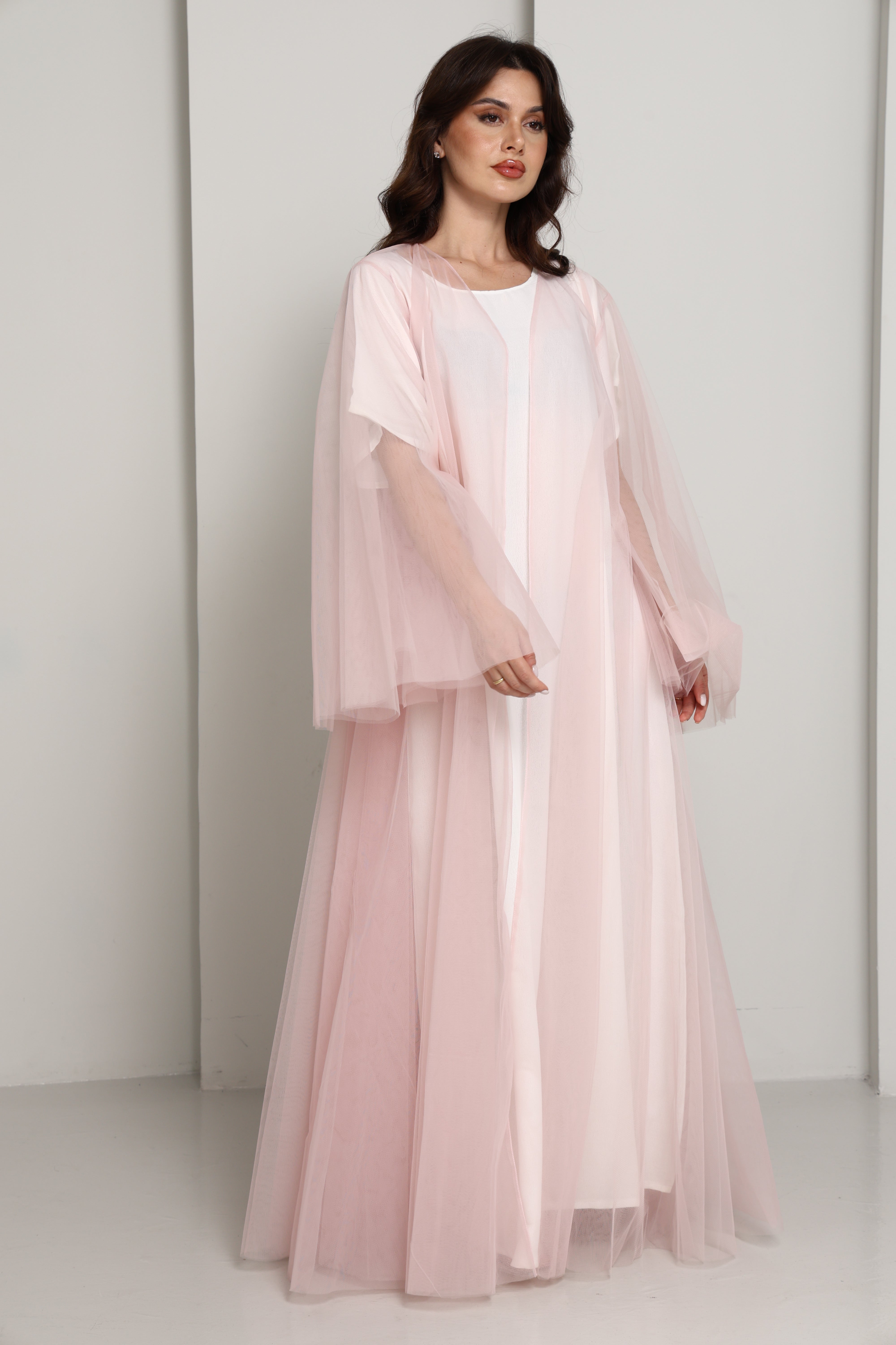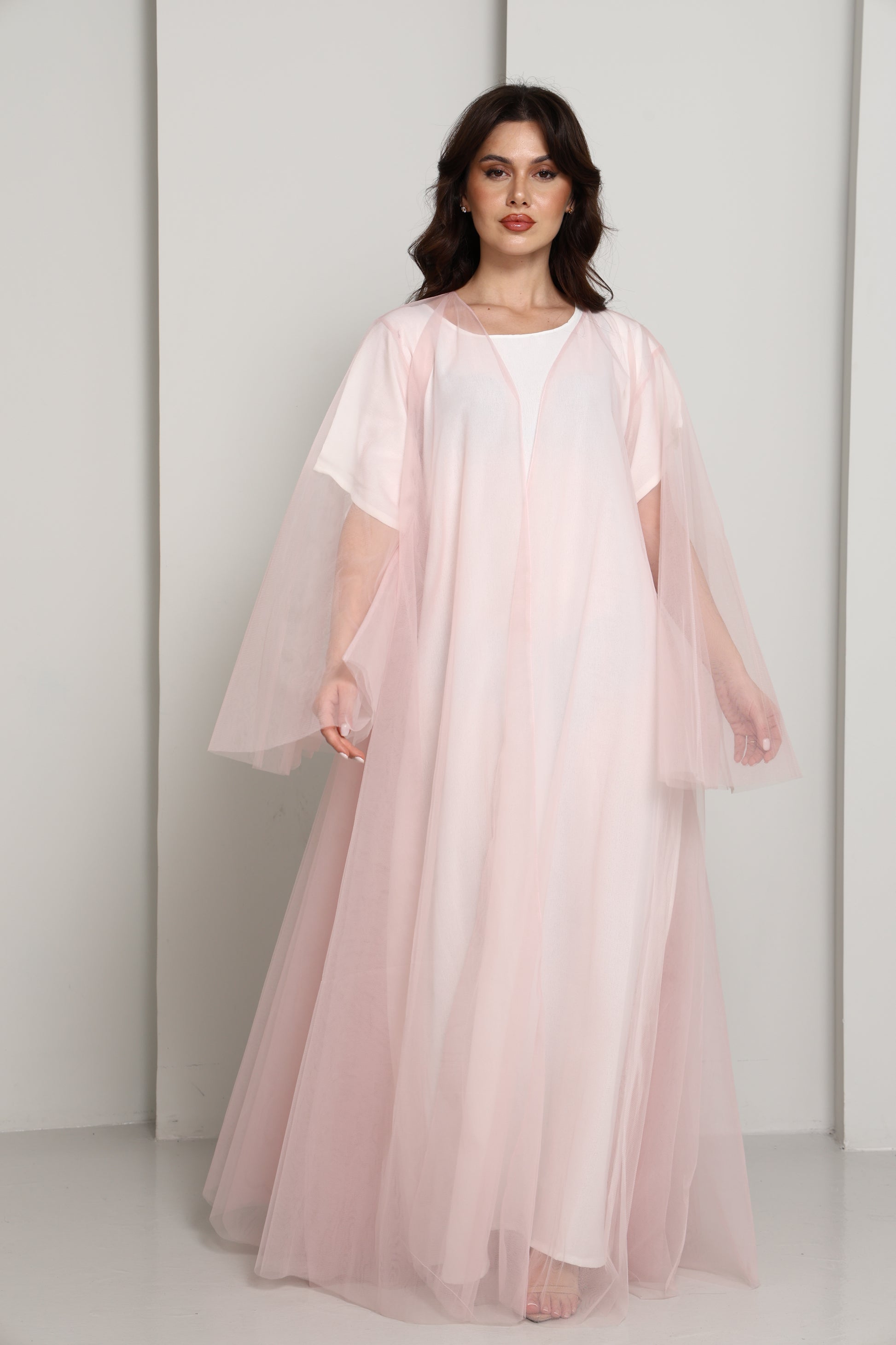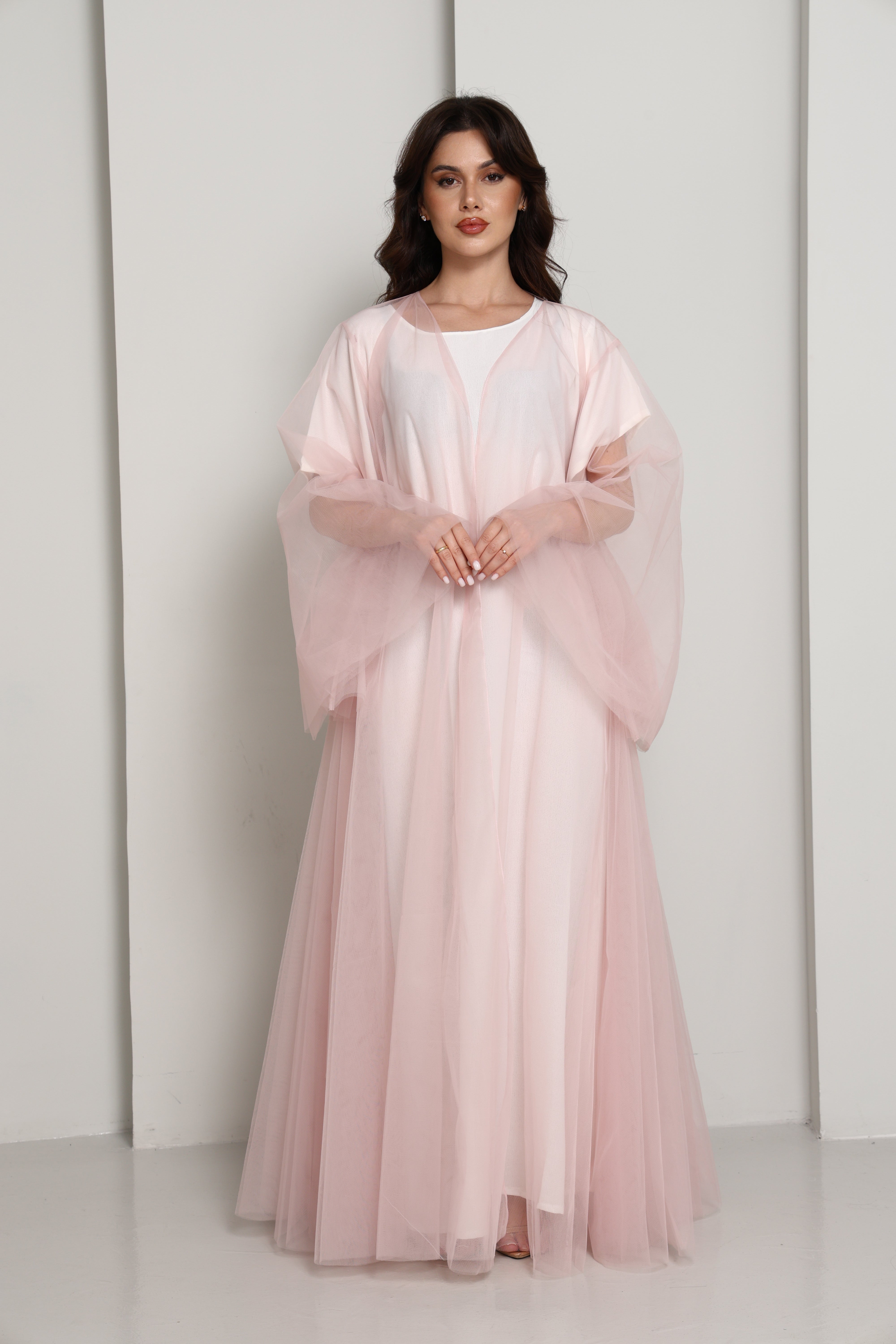The delicate blush pink hue and sheer texture offer a modern, feminine take on the traditional abaya, making it an exquisite choice for special occasions.